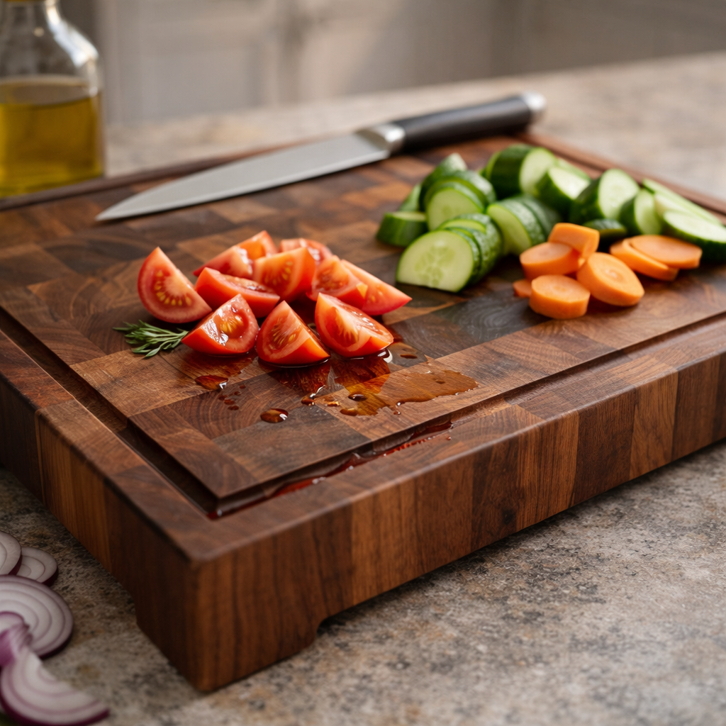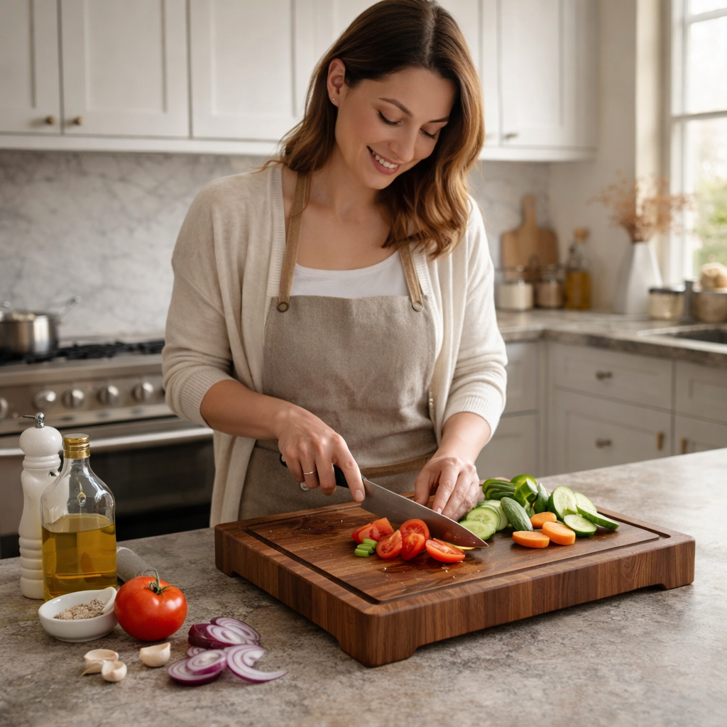 Lesen Sie weiter und entdecken Sie, wie dieses intelligente Stirnholz Schneidebrett aus Nussbaum nicht nur Ihre Arbeitsfläche trocken hält, sondern Ihr ganzes Kocherlebnis aufwertet…
