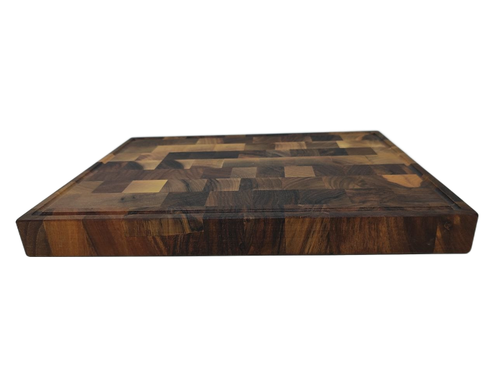 Die Herstellung eines Stirnholz Schneidebretts aus Nussbaum mit Saftrille erfordert besonderes handwerkliches Geschick. Die Rinne muss präzise eingearbeitet werden, ohne die natürliche Schönheit des Nussbaum Stirnholzes zu beeinträchtigen. Jedes Brett wird mit größter Sorgfalt gefertigt, wobei wir besonderen Wert auf die harmonische Integration aller Elemente legen.